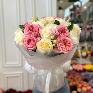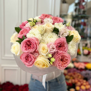 * Rose,Lisinthus,Crisantimum Bloom,Ruscus