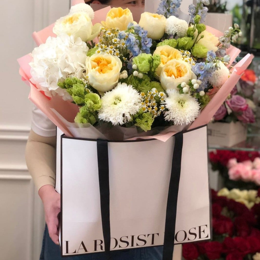 * Rose,Lisianthus,Hydredia,Dhelfinium,Tanacetum,Crisantimum,