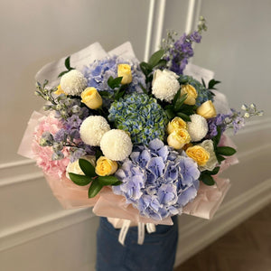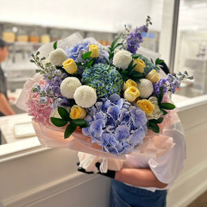 * Rose,Hydredia,Crisantimum,Dhelfinium.Ruscus,