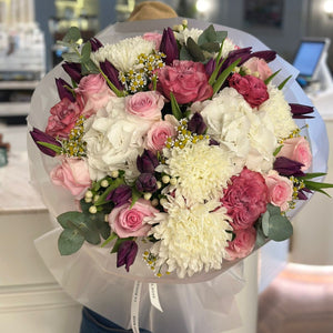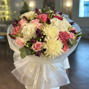 * Rose,Tulip,Hydredia,Tanacetum,Hypericum,Eucalyptus.Crisantimum