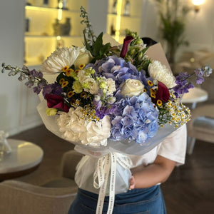 * Rose,Hydredia,Dhelfinium,Lisianthus,Tanacetum,Astromeria,Santini,Lotus
